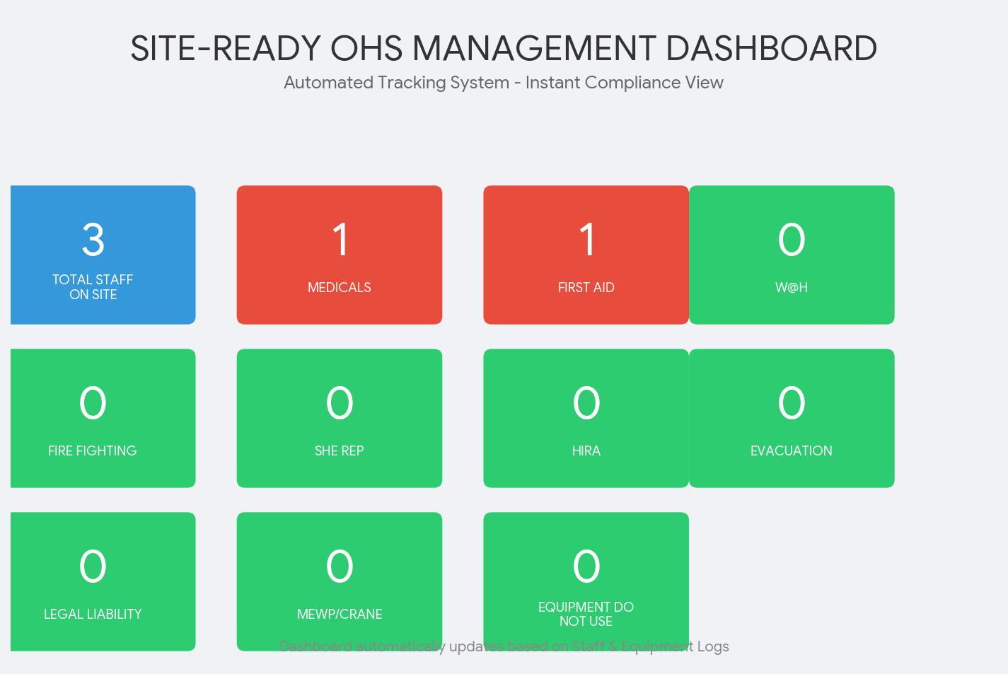 The Site-Ready OHS Management Dashboard is designed for Safety Officers, Site Managers, and Contractors who need to prove compliance instantly. Simply update your staff and equipment lists, and the Dashboard automatically calculates what is valid and what has expired.